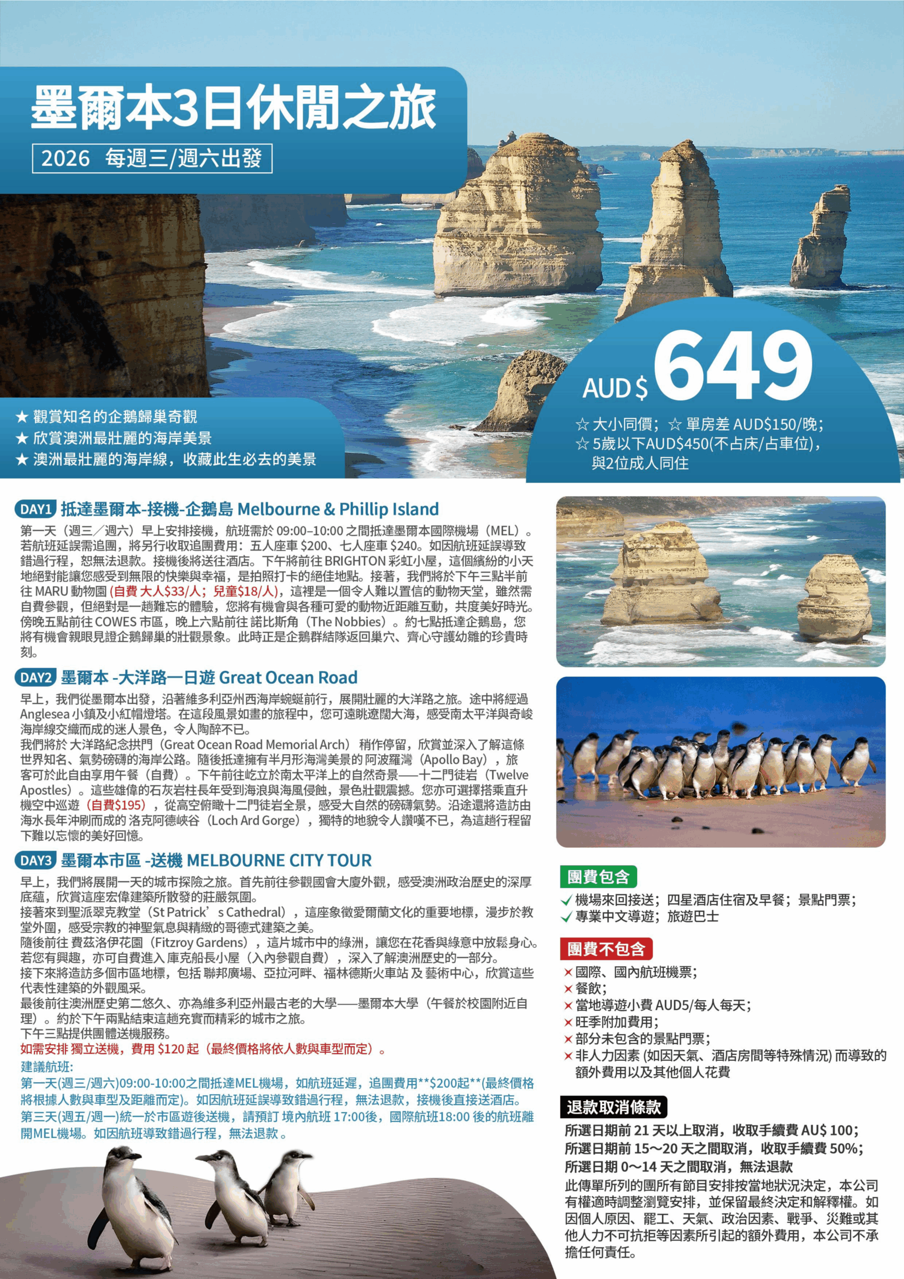 ★ 觀賞知名的企鵝歸巢奇觀 ★ 欣賞澳洲最壯麗的海岸美景 ★ 澳洲最壯麗的海岸線,收藏此生必去的美景
